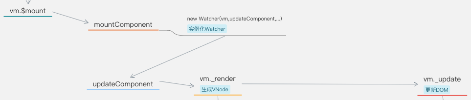 在 Watcher 实例中: vm._render() 生成 VNode -> vm._update() 更新 DOM